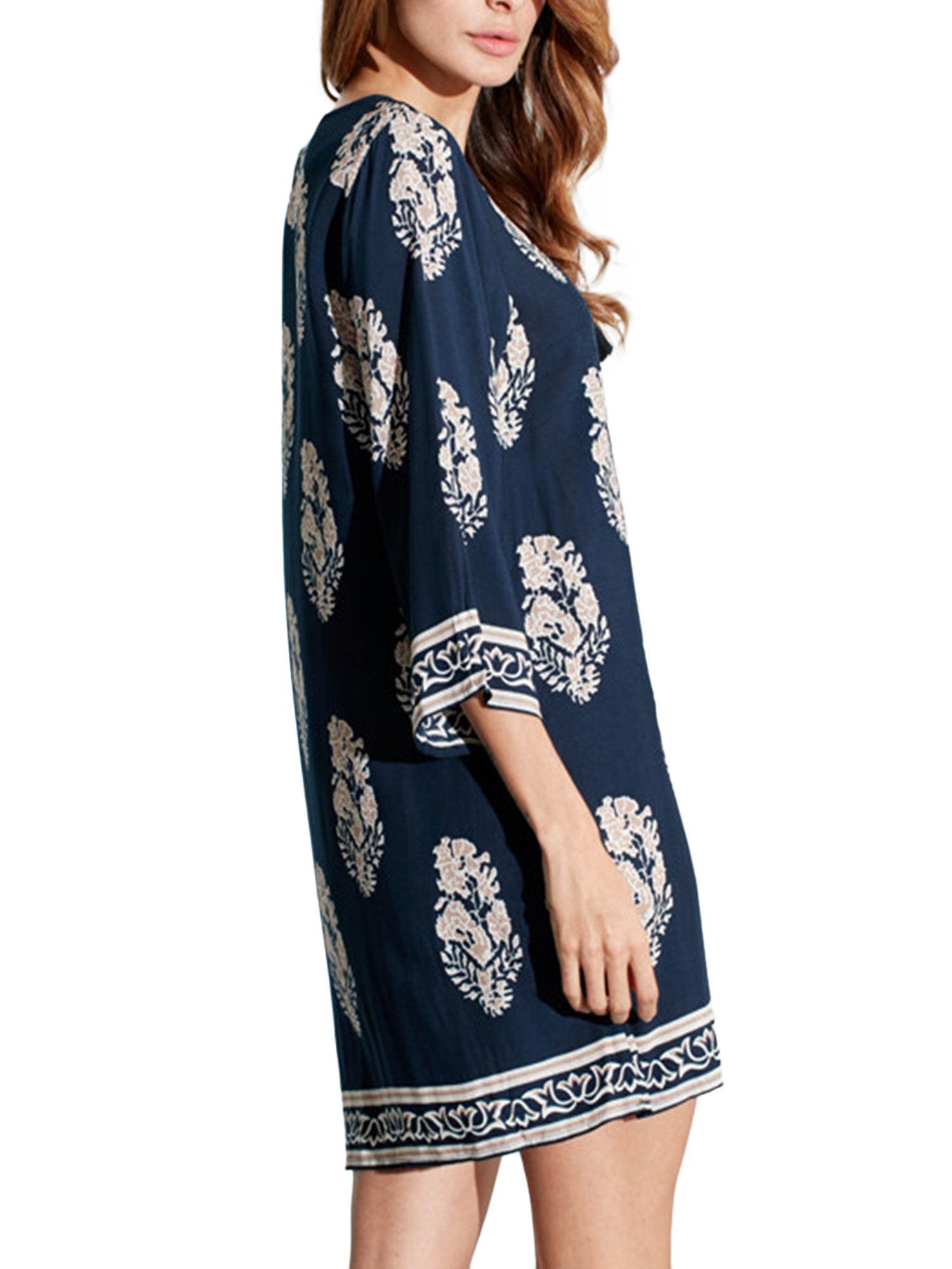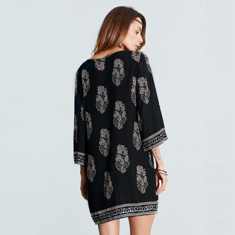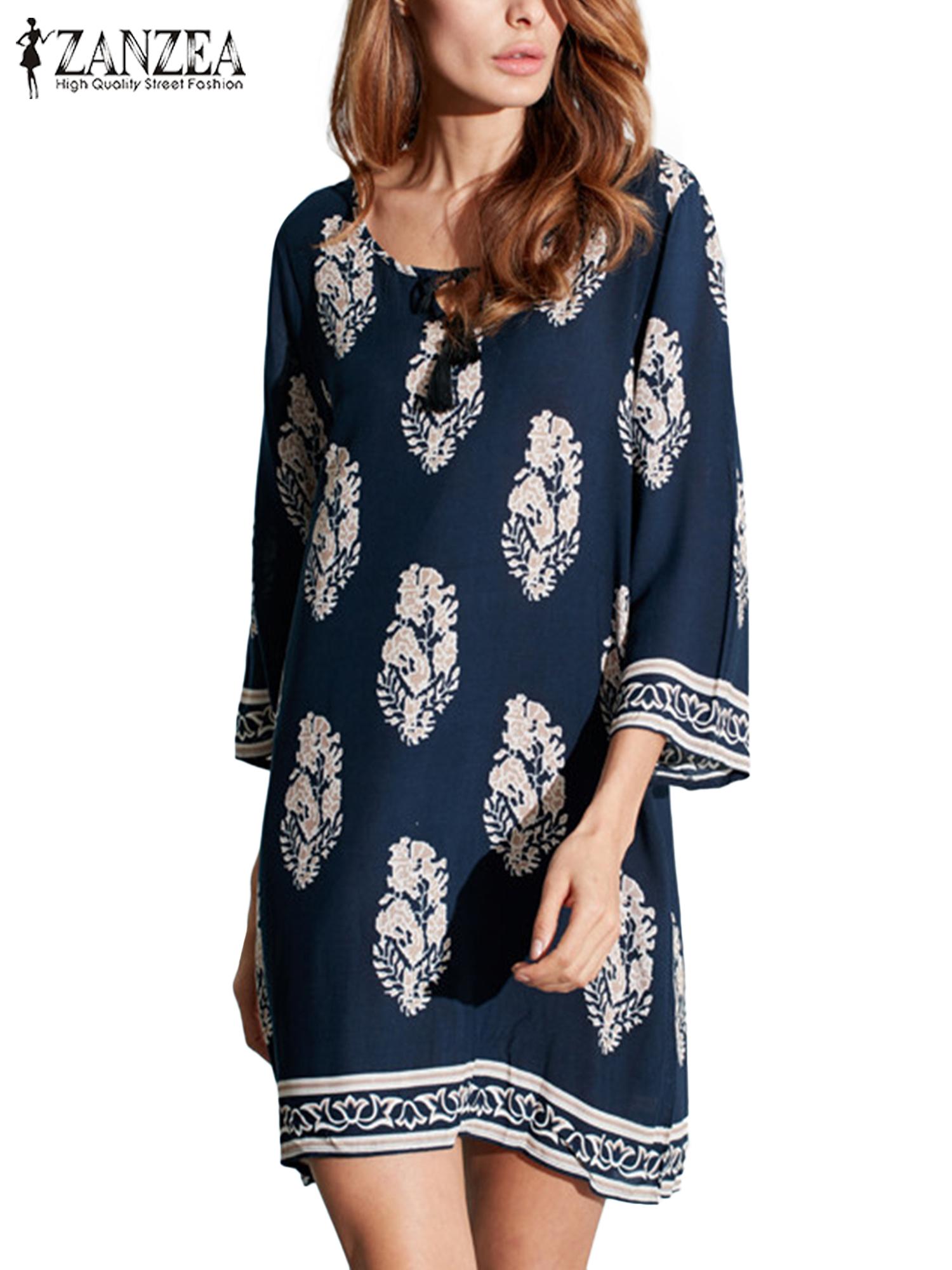 ZANZEA Women Vintage Floral Print Dress Autumn Casual Loose Mini Vestidos Lace Up 3/4 Sleeve Beach Dresses - intl