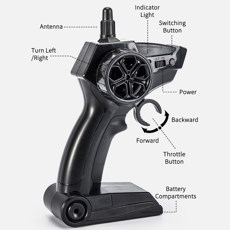 1. Product size: 29 x 18 x 13.5cm 2. Body battery: 7.4V 500mAh 3. Remote control battery: 2 x AA battery(Not included) 4. Remote control distance: 40 meters 4. 2.4G remote control, convenient and easy to use 5. Rubber tires, conquer all terrain
