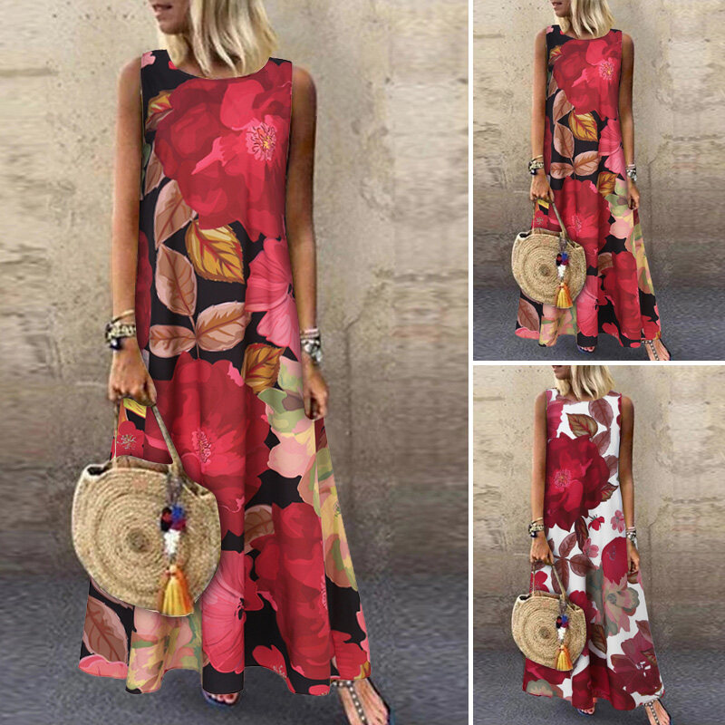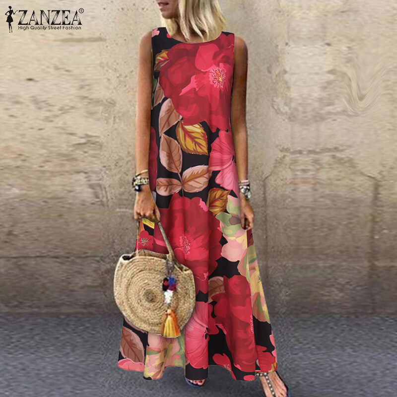 ZANZEA Women Summer Sleeveless Floral Printed Long Dress Holiday Maxi Tank Sundress