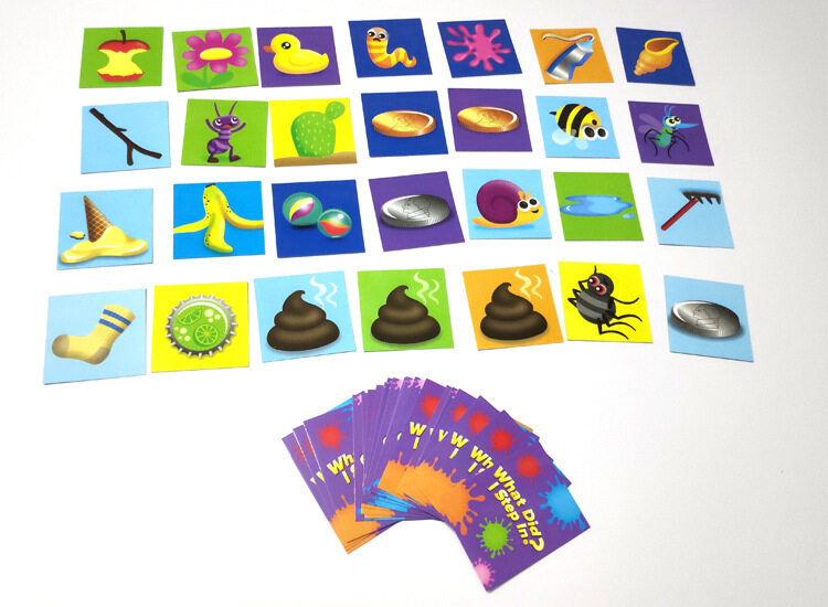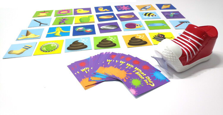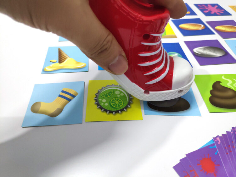 Just slam the shoe on a random card and look on the bottom to see what you stepped on. If it’s a match, you score a point! There are also lucky coins to add to your score, but watch out for the dog poop! That’s like losing a turn. And stinky!