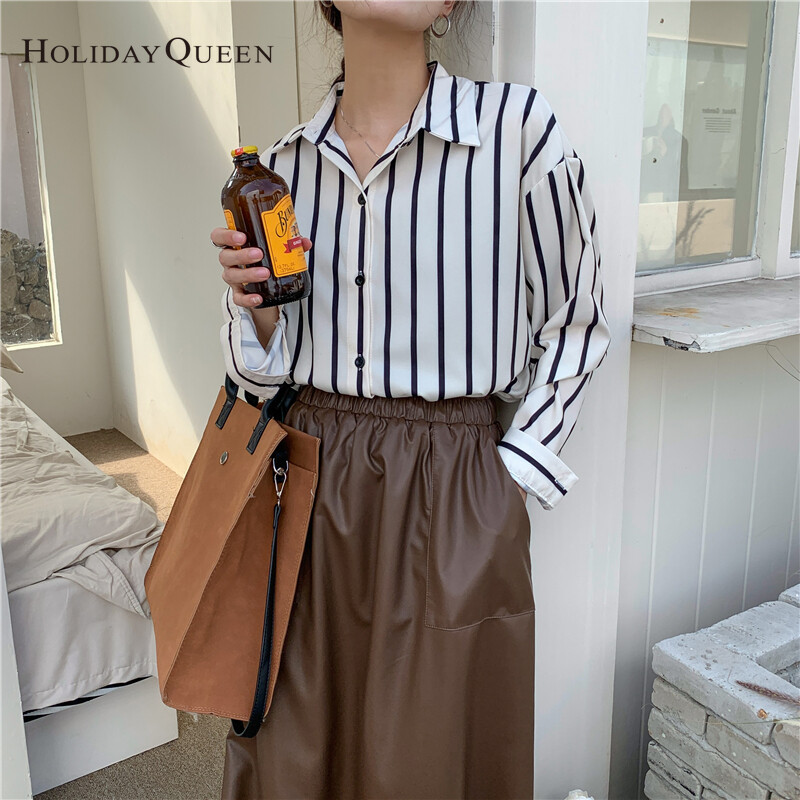 HolidayQueen French All-match Long-sleeved Striped Shirt Women's Design Sense Niche Early Autumn Temperament Tops Lazy Hong Kong Flavor S M L XL Free ShippingWomen's clothing HQ1030