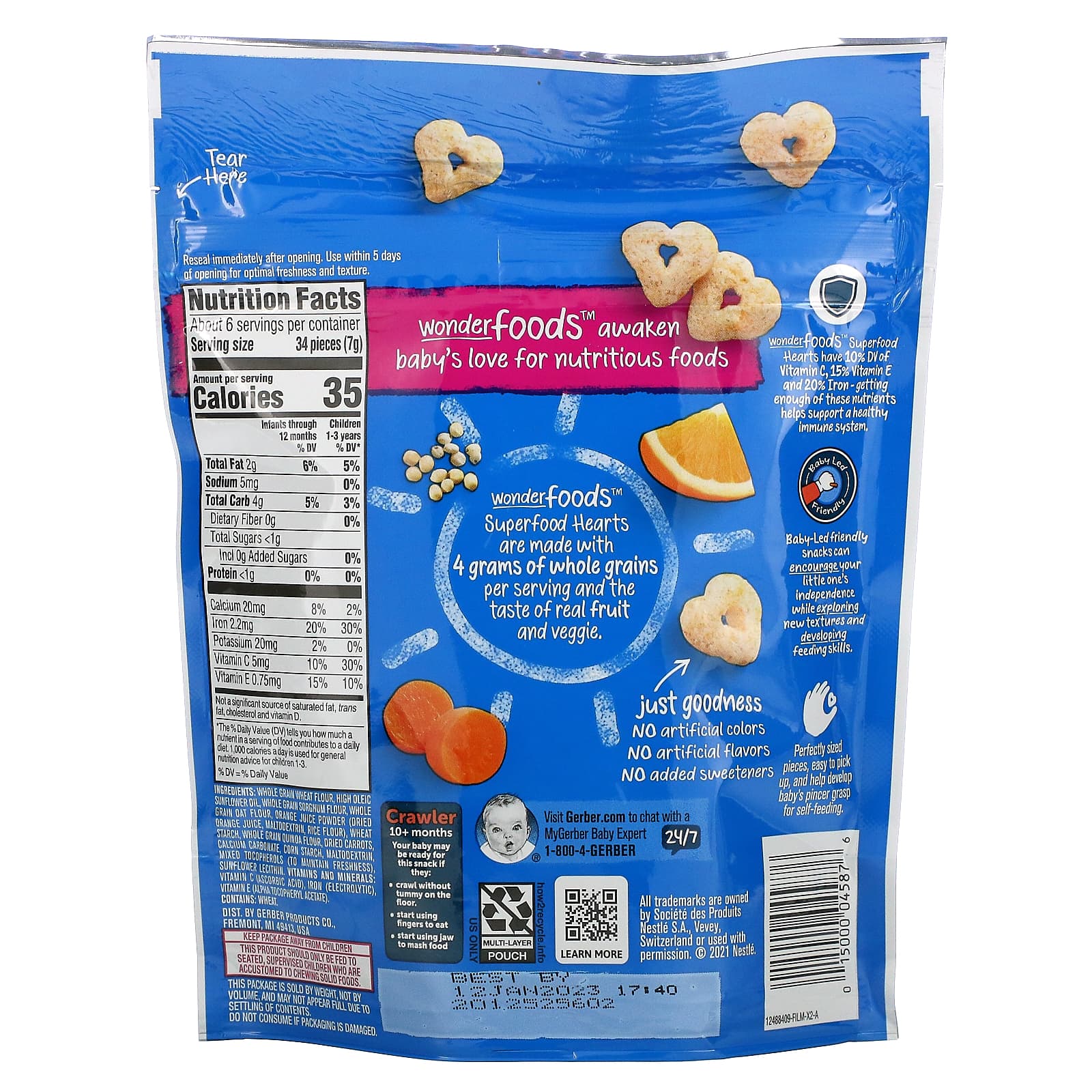 Gerber, Wonderfoods, Snacks for Baby, Puffed Multigrain Snack, SuperFood Hearts, Baby Snack, Quinoa, Orange, Carrot, 10+ Months, 1.48 oz (42 g)