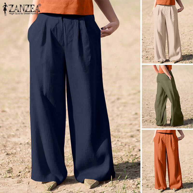 ZANZEA Women Commute Vintage Casual Pants Versatile Cotton Linen Solid Loose Wide Leg Trousers #15