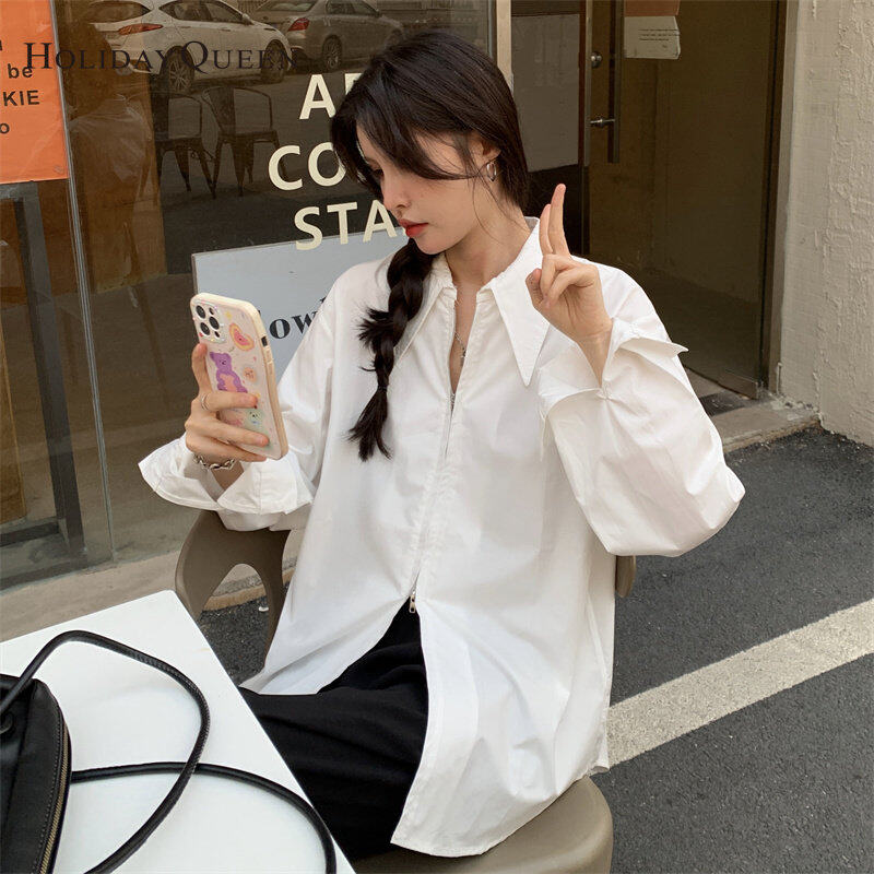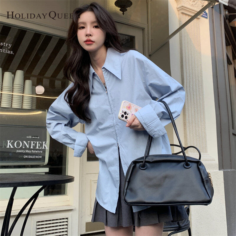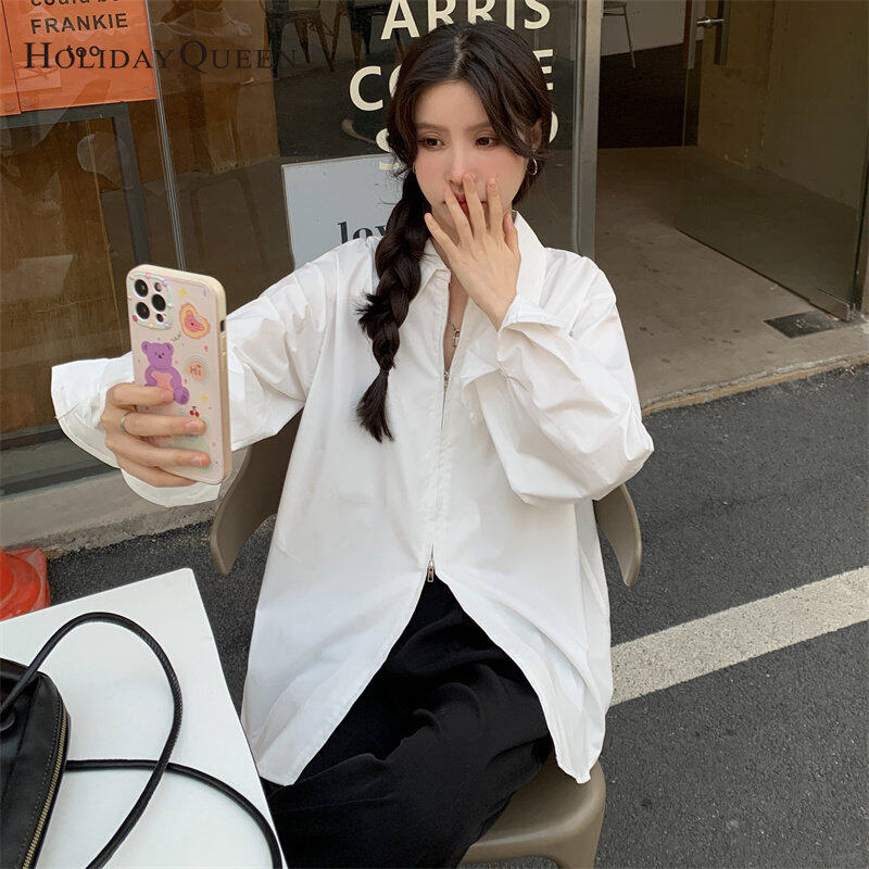 HolidayQueen Korean Loose Top Autumn New Design Niche Double Zipper Solid Color Long-sleeved Shirt Women Free Shipping HQ1826