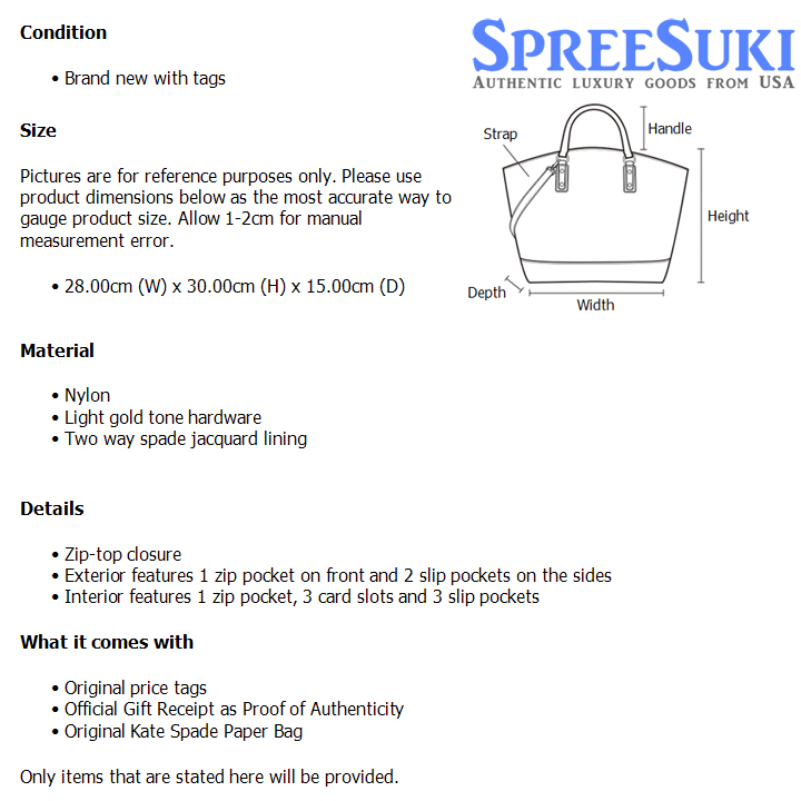 All our products are 100% authentic and purchased from Kate Spade stores in USA. We are a reputable registered business in Singapore and it is illegal to sell counterfeit goods in Singapore. This product also comes with a gift receipt which is printed by the Kate Spade store that we purchased the item from. It states the item that we purchased and the Kate Spade store that it was purchased from, proving the authenticity of the item. Buy with confidence.