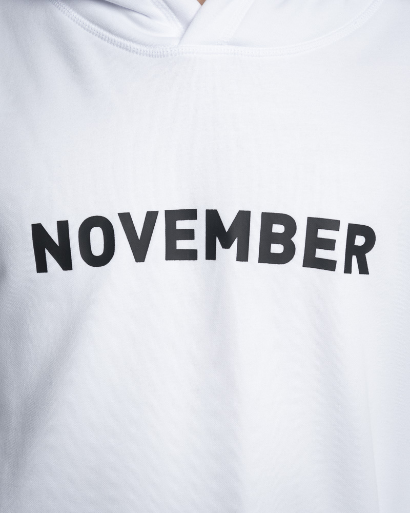 Regular Solid Coloured Long Sleeve Pullover Hoodie with Kangaroo Pockets at the front. Comes with NOVEMBER Slogan Patch at the front. Made of cotton.