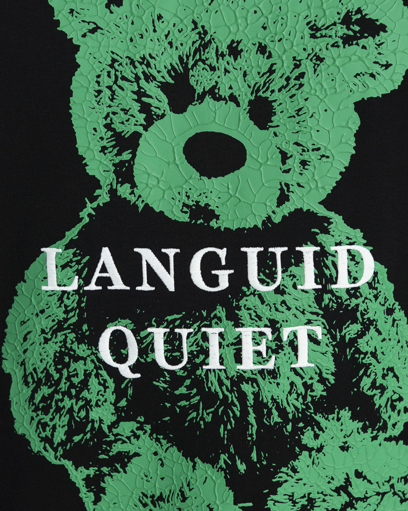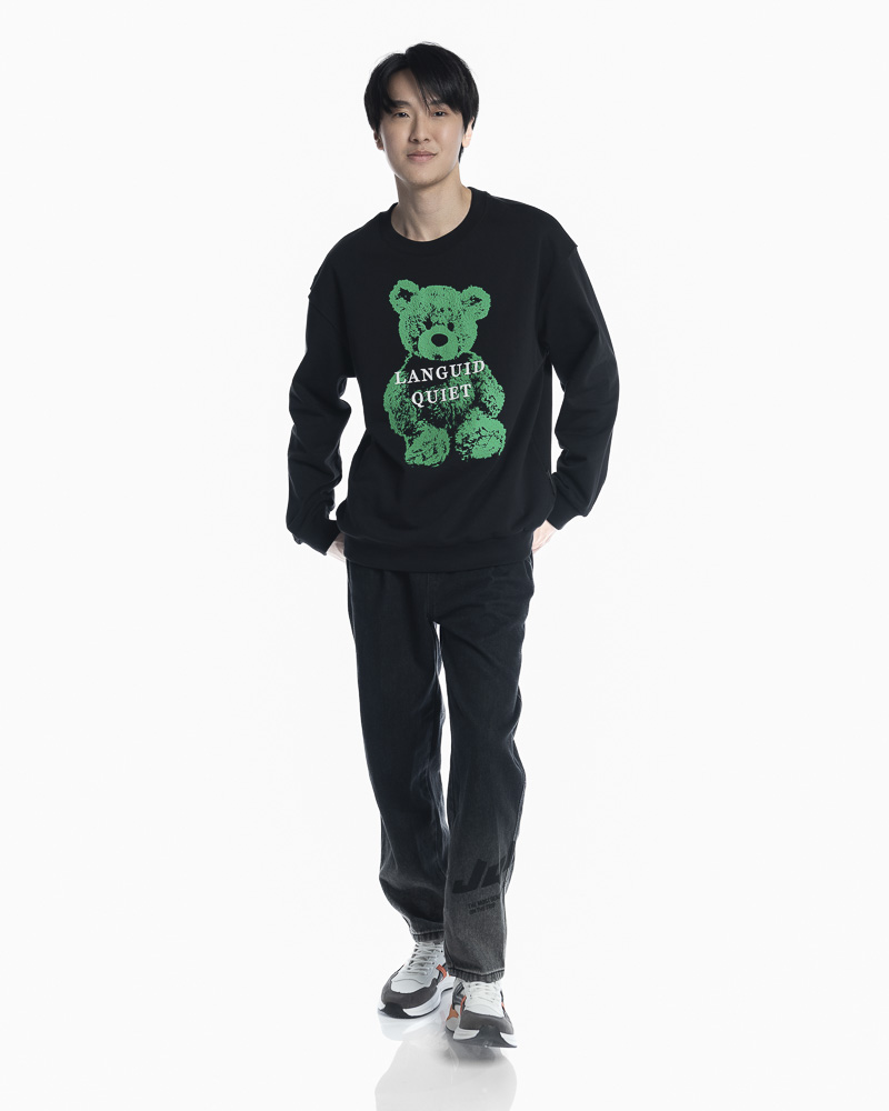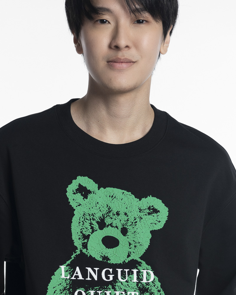 Regular Solid Colour Long Sleeve Sweatshirt with Round Neck. Comes with Green Rubber Bear Patch Embroidery and "Languid Quiet" Slogan Print at the front.