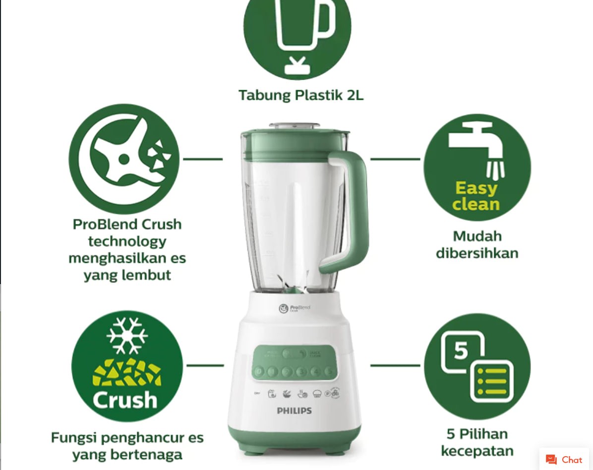Blender serbaguna Philips ini kuat, awet, dan multifungsi, cocok untuk membuat jus, bumbu, dan berbagai olahan lainnya. Dilengkapi teknologi ProBlend Crush yang mampu menghancurkan bahan keras seperti es batu dengan cepat.